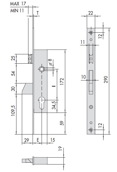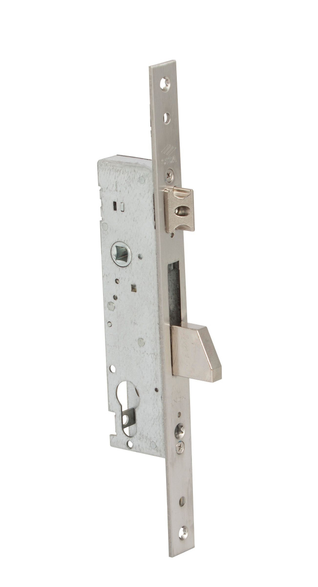 Тип дверей: алюминиевые и пластиковые профильные двери, в т.ч. со стеклом. (E=35) Описание замка Механика CISA 46215 имеет поворотный механический ригель, управляемый одним оборотом цилиндрического ключа стандартного профиля, и защелку, управляемую либо ручкой со стандартным 8мм квадратом, либо ключом. Замок реверсивный, направление захлопывания защелки меняется путем перестановки. Видимая лицевая планка замка выполнена из нержавеющей стали. Замок снабжен специальным укрепленным против перепиливания механическим ригелем и оцинкованной полированной защелкой. Имеется три модификации замка, отличающиеся расстоянием от торца до оси цилиндра: Е=25/30/35 мм.